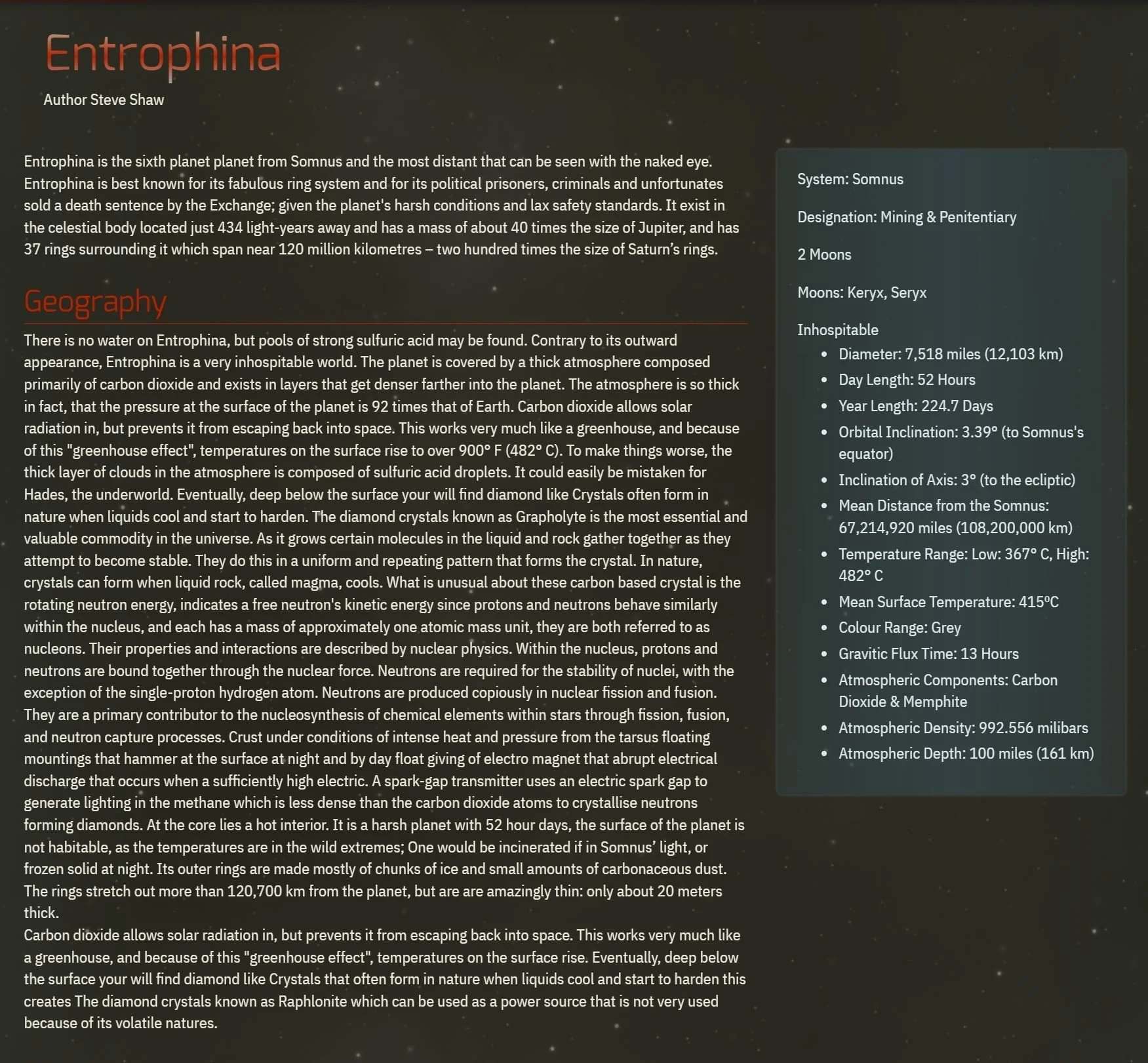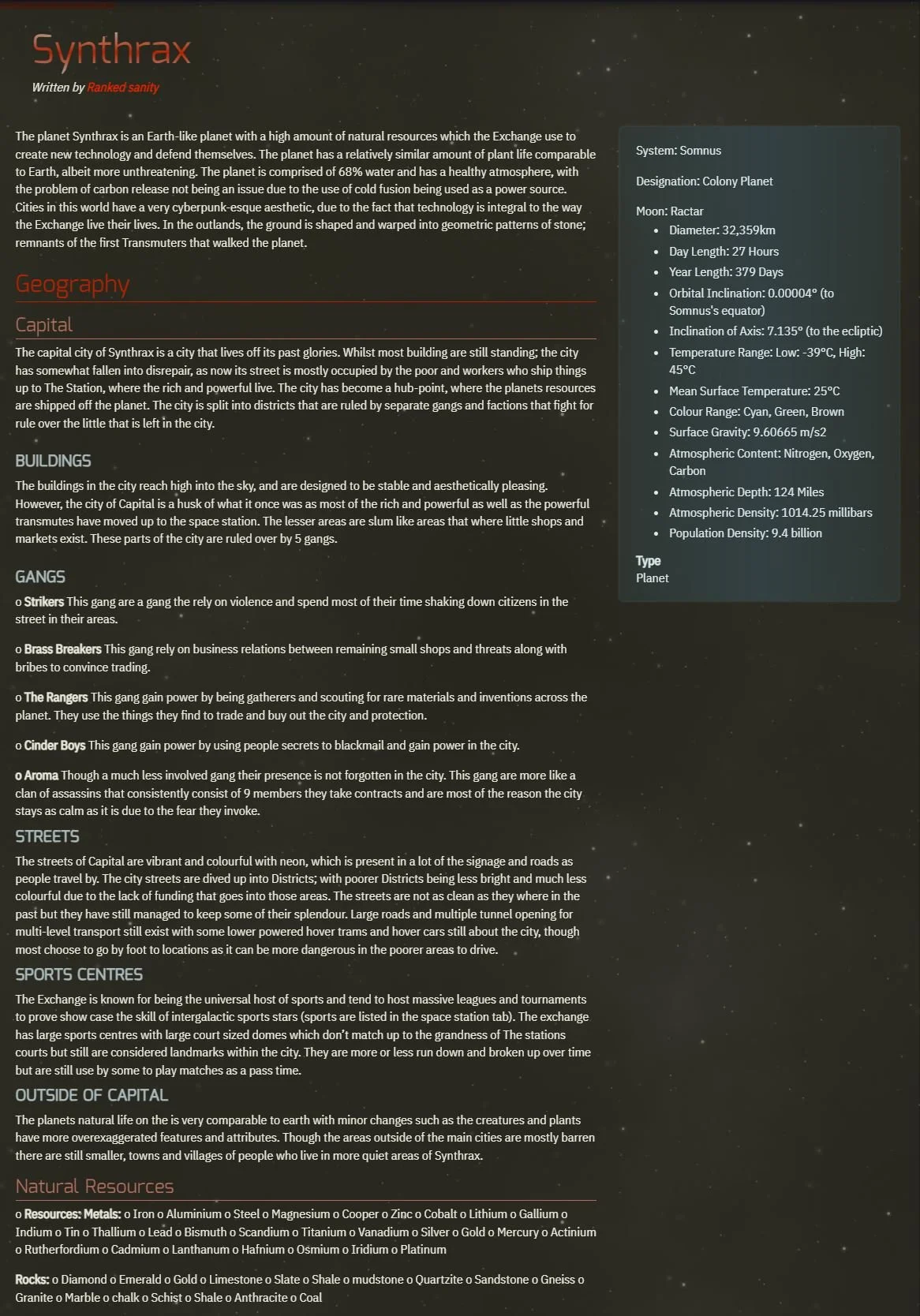 Down here you will find some world building examples of planets and civilizations designed for a game set in a sci-fi setting that incorporates fantasy elements in the form of a magic system.