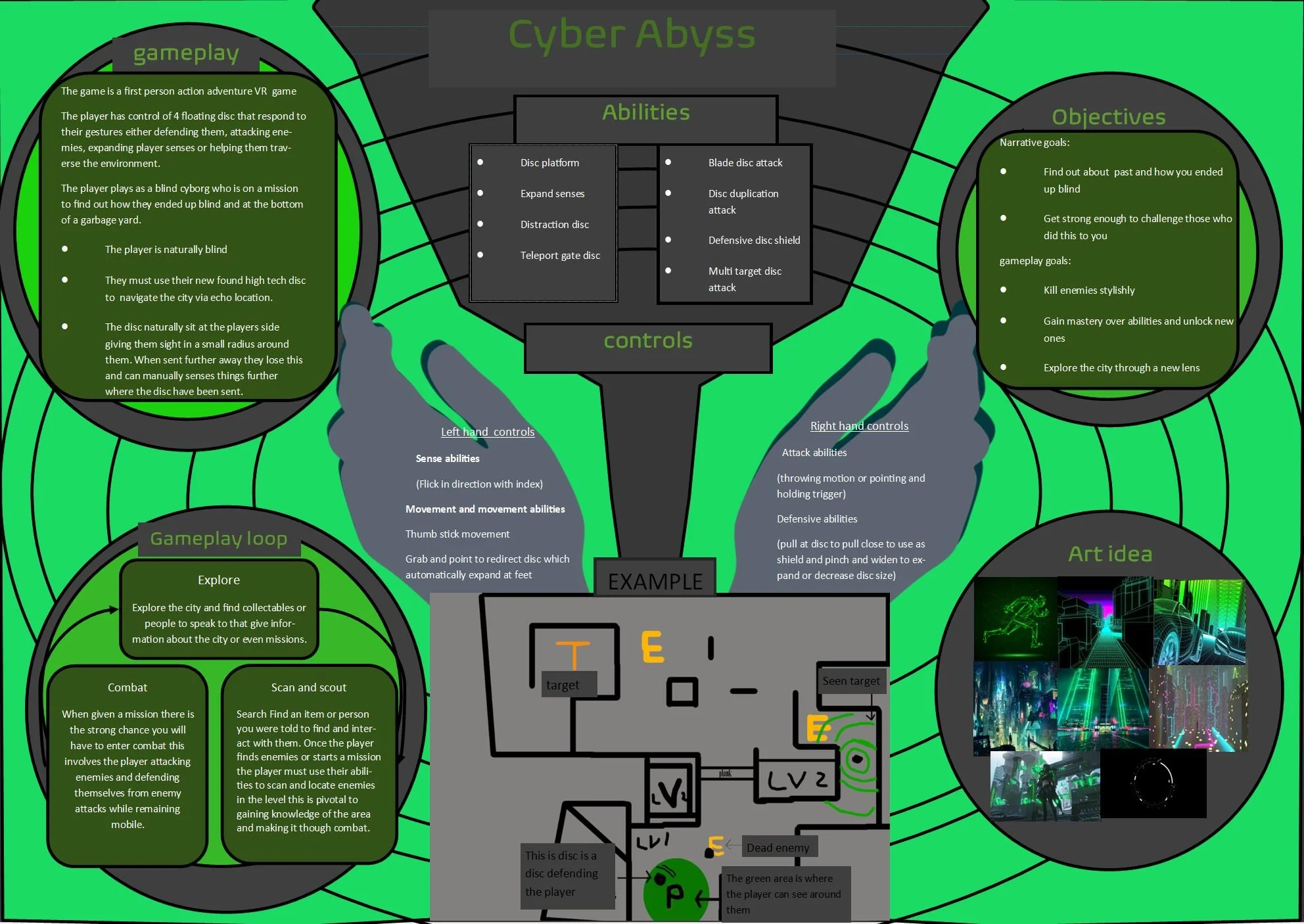 This document below showcases my ability to convey are large amount of information in a small format and that i can create interesting and innovative ideas that make use of Virtual reality systems.